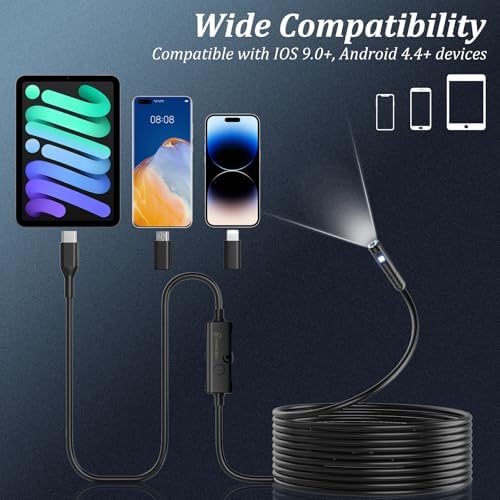 Dual-Lens 1920P HD Pixels: The endoscope inspection camera has 1920P HD pixels to present clear images and videos. 8 adjustable LED borescope camera +1 side lens provide broader perspective, clear images even in dark environments. The endoscope is equipped with a 7.9 mm probe, which is compact and portable. Wide Compatibility: Borescope inspection camera comes with an iPhone/Micro USB adapter. The drain camera is compatible with Android devices with OTG function (Important: Please confirm that your Android phone supports OTG function before purchasing). For iPhone, just plug it in and get started. Easy to use: Search "SUP-ANESOK" in the app store, download and install. Or scan the QR code and choose to download the APP. Inspection camera is suitable for Android 4.4+ and iOS 9+ and above systems. The endoscope does not require Bluetooth or WiFi connection, no need to charge separately, and no need to worry about connection errors. ATTENTION: If it does not work properly, please update the APP version. Semi-rigid and IP67 Waterproof: The sewer borescope camera has a 5-meter-long semi-rigid cable, giving you more convenient control during operation, the snake endoscope inspection camera achieves a balance between rigidity and flexibility. The borescope inspection camera is IP67 waterproof and can be used as underwater cameras, waterproof mini cameras, car detectors, sewer detectors, etc. Package Contents: 5m dual-lens endoscope camera*1, magnet*1, hook*1, mirror*1, fixture*3, iPhone/Micro USB adapter, user manual*1. Suitable for Android, IOS, Samsung series and Google mobile phones, and more compatible models are being updated.