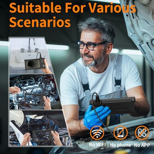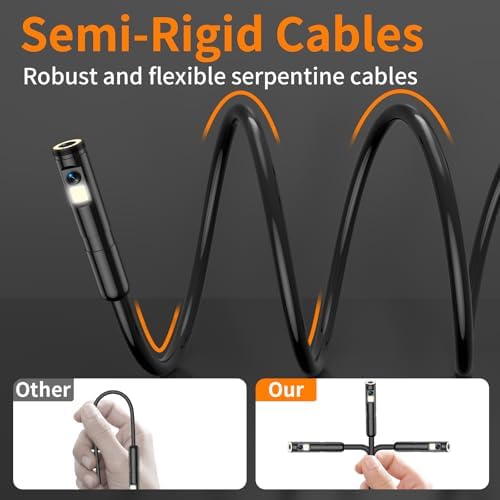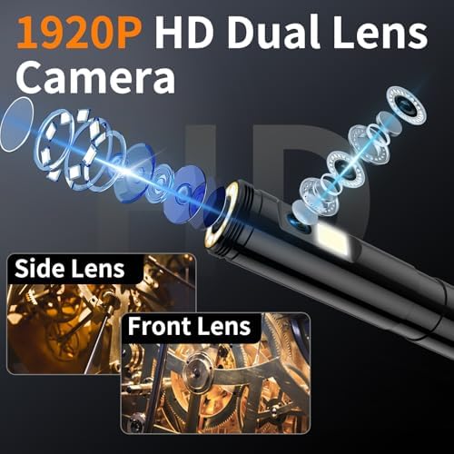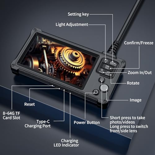 5-inch 1920P HD Screen: 5-inch larger IPS HD screen, endoscope inspection camera lens transmits 1920*1080P resolution HD images without delay. Endoscopic cameras capture precise detail, realistic textures and significant contrast, and larger screens present higher quality images. Dual Lens for Larger Viewing Angle: Ennovor 5-inch screen borescope has two lenses, the front lens and the side lens can be switched freely by long pressing the camera button to expand the viewing angle. 5-meter semi-rigid cable contains a superconducting copper core that allows the ennovor inspection camera to bend and maintain its shape in a variety of environments. The magnification of the endoscope camera is 1.0X-1.5X-2.0X, and the viewing Angle can be changed by 180°. Press the freeze button to seize the moment to facilitate fault location. IP67 Waterproof: Screen borescope camera semi-rigid cable is able to easily pass through narrow spaces, allowing you to inspect behind walls, vents, pipes and other narrow areas that are difficult for the human body to reach. The IP67 waterproof rating allows the endoscope inspection to be used normally in the presence of water. The Ennovor Endoscopic camera is a must-have for mechanics, car enthusiasts and homeowners. 8 Adjustable Leds, 1 Side Led: Ennovor endoscope front lens has 8 led lights with 4 adjustable brightness levels for underwater and dimly lit environments. Eight adjustable led lights provide excellent brightness, allowing you to see better in the dark. It can be safely used to check sewers, bathtubs and aquariums, as well as other damp, dark environments. Easy to Use, Rechargeable: Dual lens endoscope camera with light does not need to download an app or connect to WIFI, does not need Bluetooth, and can be used just by turning it on. Built-in 2000mAh rechargeable battery, portable. Ergonomic design, feel comfortable, lightweight and practical. Note: Need (8-64GTF) Micro SD cards to take pictures and videos, and the package does not contain cards.